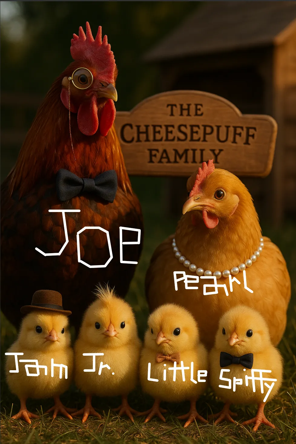 The Cheesepuff family is more than just a flock of chickens—they are a symbol of courage, resourcefulness, and the power of family. Their adventures have inspired other farm animals to stand up to predators and protect their homes. The Cheesepuffs’ carved wooden plaque, proudly displayed above their coop, reads: “Together We Are Strong.”